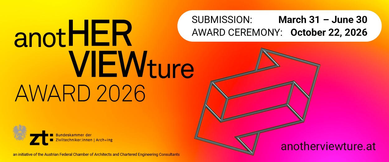 Avstrijska zvezna zbornica arhitektov in pooblaščenih inženirskih svetovalcev vabi na oddajo kandidatur za nagrado anotHERVIEWture Award 2026, za prepoznavnost žensk v arhitekturi in inženirstvu.
