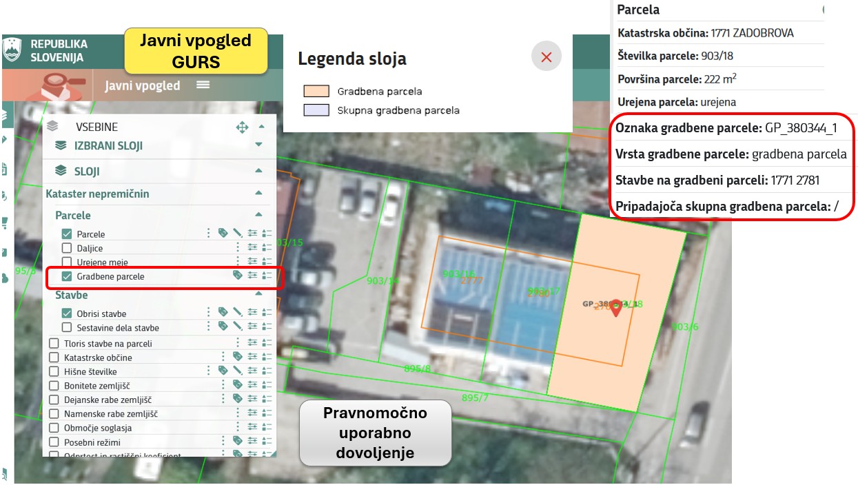 V kataster nepremičnin se izvede vpis gradbene parcele stavbe po pravnomočnosti uporabnega dovoljenja. V javnem vpogledu Geodetske uprave RS so gradbene parcele vidne od 3.2.2026 dalje.